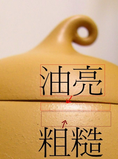 上圖中,您框起的紅線框有上、中、下計三個框,上、下兩框處是木拍子拍出的“泥片正面”,而中間的那個小框(較亮處)卻是泥片的“橫剖面”,故兩者的砂漿結構就會有所不同(因上下兩框是拍出的實面,而中框是橫剖面,是切出並非拍出的面),所以當壺作好後要有一道光明針的步驟,光好明針後看起來胚體都是光亮的,而入窯燒成時卻因會涉及正面泥片與橫剖泥片收縮比不一樣的問題,有些泥質就會顯現出“正面泥片與橫剖泥片”因收縮比及砂漿比不同,所造成的亮度與顏色差。
