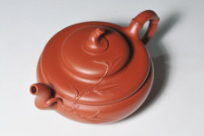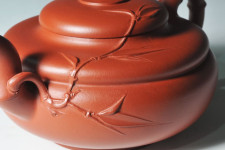 作品的壺把以竹節彎折而成,壺把亦以竹節築出三彎流形式,優美又有精巧細緻的味道,韓老師本作最奇妙的巧思是從壺流的竹節處,長出一精美小巧的小竹枝蜿蜒而上,綻放出片片竹葉,由壺腹往上直至壺肩、壺頸,甚至蜿蜒上壺蓋邊上,與壺蓋側的一小節竹葉枝合而為一,充滿著神奇的趣味與竹子的生命律動感,讓愛壺人玩味再三…,久久無法釋手。