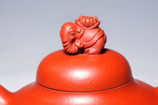 本壺以豐盈光潔的蓋面及壺身筒,配上十分易於持拿開閤壺蓋的小雕塑為壺鈕,壺鈕以吉祥福泰可親的大象為主題,象被上背著滿簍的財寶與吉祥,與擁有者共享一生的富貴與吉祥!