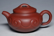 細細品鑑此作品,能輕易的讓人感受到十分難能可貴的英爽秀麗、莊嚴成熟的特異風格,賦予傳統作品嶄新的生命與更完美的詮釋;如意型壺鈕厚實而豪放,壺身筒之如意圖騰凹凸有致、筋紋處的精加工柔順而自然…,壺身下部收斂較大與高祧,壺頸與壺口的過渡與口蓋寬度也做了適當的調整與變動,嘴與把的銜接角度和老練,使作品輕易的散發出瀟洒脫俗的俊逸氣質,這種過人的加工手法,加上高貴而不貴的低價,實為物超所值的最高呈現!