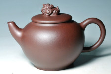 本作品在略高飽滿的身筒下方,韓洪波所長施展了韓氏圈足的巧妙線條,略呈凸面的蓋面上頭,妝點了一隻似石器雕琢般剛健的辟邪,配上韓所長經典的韓氏壺嘴與壺把,使此件採用外太空名泥的曠世巨作更形完美與稀有!