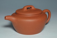 寬廣而開闊的壺口蓋,使置掏茶時十分便利,橋鈕以渾方角的剛毅方式呈現,蓋沿厚度略大於壺口圈子的厚度,使作品有沉穩莊重之感,配上微彎而流暢直率的明式最風行之壺嘴形式,及把內略平的壺把,也確保了持拿時的穩定性,和採用較難製作的內包式圈足,使作品散發出作者內斂而不取巧的特殊性格,可真是壺如其人呀!