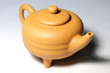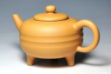 三足鼎力之勢,將壺體襯托出蕩漾動感的視覺感受,更添“清波漣漪”之感…,作品以上衝有力的壺嘴造型,呼應出壺把的婉轉簡約,剛柔相濟,實美不勝收至極…;蓋面以較為輕盈的儀態,輕閤身筒上方,恰當而完美的融入了整體的氛圍,使本作的低調奢華之風表露無遺,直讓人百看不厭,愛不釋手矣…。
