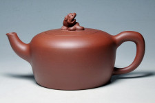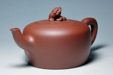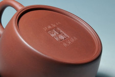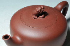 本作品乃工藝美術師高峰老師1990年代於古農真壺旗下承包時所創作,作者高峰工藝師以龍生九子之~【螭吻】形象為壺鈕,搭配極為光素古雅的壺身與簡練的線條,採圓潤的卡蓋手法創作,更凸顯出壺鈕之幽雅視覺效果;壺底圈足特意造出一小圈圓潤的凹線過渡,也間接展現出作者的過人製壺工藝與藝術內涵,誠為高峰老師創作的頂級作品之一也!