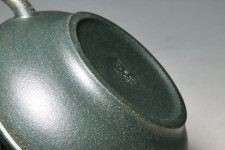 古農真壺這次特地採用茶湯十分清甜、甘美的稀世名泥~【老豆碧】為胚來創作新品,在海藍中泛出綠意的胎色中,這位古農真壺陶藝高手打出寬而略扁的潤和身筒,腰身裝飾一凸線泥條,頓使作品充滿生命力與巧妙之感,順勢拉起的壺嘴線條,和圓潤富張力的壺把過渡與曲線,襯托出作品的勻稱之美感!