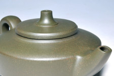 蓋沿造出凹線小過渡,配合鈕座的明線,與聳立而起的壺鈕,使寬扁的壺身與大塊面的留白,頓時生動豐富了起來,…也創造出作品無限的生命力與美感;上揚的渾角長式壺流形式,巧妙的呼應了渾角有勁的壺把,完成了一件完美的傳世級佳品!