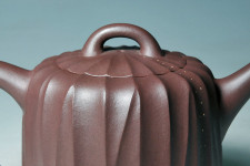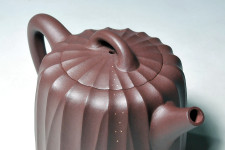 【飄菱系列~翔菱壺t】,以不規則的筋紋為設計要素,為保不失實用的高功能性,壺蓋通轉無礙,使開闔壺蓋十分便利而順暢,最有創意的是...,因為身筒的筋紋既是不規則型,故要確定轉到所有筋紋全部吻合時,會變得較費工夫,所以韓所長很聰明的...,在生胚成型後,特地將所有筋紋對正後,從橋鈕下方開始,壺正面近壺把處,以舖砂的手法,將稀世名泥〝沁碧〞之生砂顆粒一顆一顆的舖在固定的兩條凹紋上頭,壺反面近壺嘴處,亦由橋鈕下方開始,舖砂在一條凹紋上頭,只要您將舖砂條對正,壺的所有筋紋就已全部對正,真是很聰明而創意的構思,看到後真讓人莞爾一笑,不自覺的直呼『讚』!