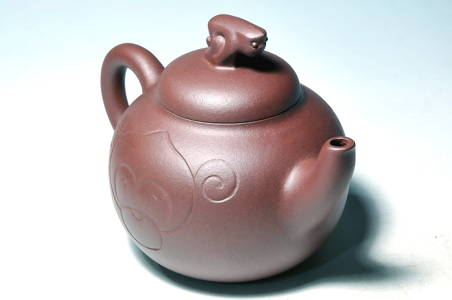 燒成後胚面微泛白霧之氣,乃高量鐵質蒸發後的特異現象,一經泡養或細心擦拭後,霧氣盡去,換來的是溫潤剔透的質感,與棕紅近紫的變幻色調,十分迷人而高貴。