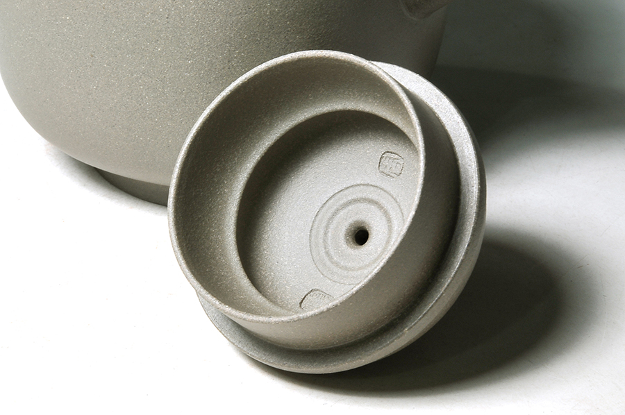 壺蓋的作法,周偉君老師是先打出一片拱起的蓋面泥片,再貼上一片平面的蓋沿片子,再疊貼上一片厚厚的蓋牆片子(當然也另有圈築出蓋牆的作法),周偉君老師遵循著老麻瓜的「循循善誘」,務必尋求必要的「同中求異」之巧思,所以不厭其煩地,先用「旁皮刀」僅小心的成圈切割深度只到「蓋沿片」處(先切割出蓋牆),然後再縮小切削直徑,切除圈蓋沿片的中央小片子成洞,以打造出「雙層蓋」的手工直接視覺效果!(請參考上方本作品~渾太極壺的蓋內特寫照片)