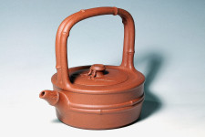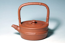 除了工藝之美、形式之美、泥料之美、窯溫之美外,其雙竹并在一起,高而平整的提樑形式,更是作家的最高挑戰,製作時生胚較濕極易變形扭曲,生胚較乾時雙竹合併處的稀泥漿則極易窯裂,兩竹乾濕不勻時,更是窯裂扭曲同時發生,可謂牽一髮而動全身,動則得咎是也!