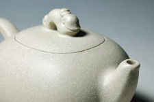 本作品為韓洪波所長挑戰高難度的再一最新力作,採用色澤白皙、人見人愛的名泥「定窯白」為胚,更自討麻煩般選擇了製作難度極高的方橢圓形的身筒與壺蓋,使蓋口的處理變得十分棘手與麻煩,配上抽象的辟邪~獨鹿為鈕,巧妙的呼應出壺體之美妙曲線與過渡,真讓人回味無比,持之備感殊暢,愛不釋手!