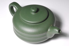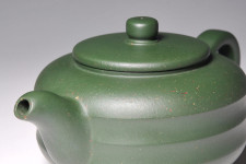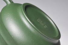 在胎表的改進上,刻意以極稀的紅、黃大砂粒點滴疏鬆的點綴於壺表上,似初雪落綠葉,具悠然神往之趣,免除了前代滴翠的單調色調,與平淡的養成效果!