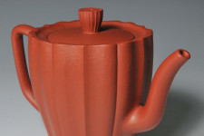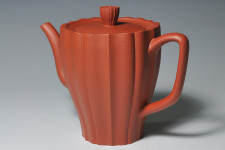 作品「凌霄壺」身筒上寬下窄,充滿挺立秀媚之氣息,身筒飾以直立凹凸筋紋的「菱花瓣」來妝點,壺肩高聳至高於蓋面,壺肩上並非一圈平面,周偉君老師更不願其煩,細心而精緻的修潤出凹凸有致的菱花瓣邊線,使作品達到了極高的觀賞境界!