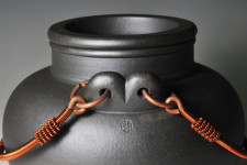 《晚青蟻跡朱泥》成品的胎表如螞蟻尋蹤過的蟻跡(如蟻足踏過的凹陷痕跡),此乃原礦中含有紅色珍稀之高縮比朱泥礦,故經高溫燒成後,始呈現十分特殊的小凹點收縮痕,胎表微細小凹點密佈不可計數,真是美不勝收,讓人直嘆大自然之奇妙珍稀!