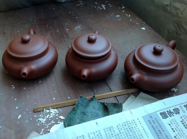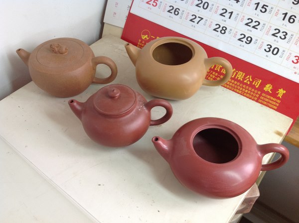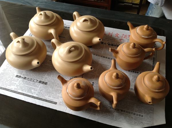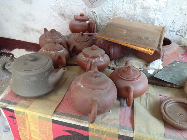 左方有橋鈕之壺,乃大皇袍的生胚;右方把上有飛扣之壺,即為燒成後尚未進入品管程序的大皇袍作品。