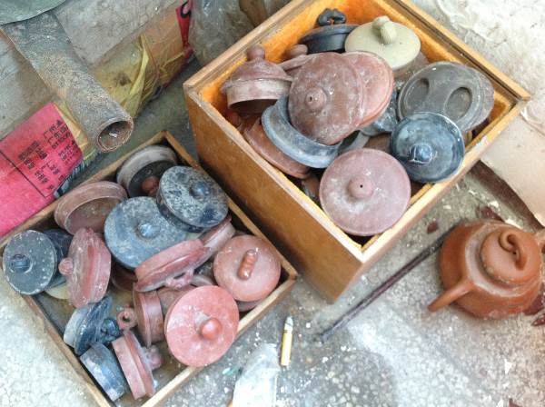 這些壺蓋基本上都是壺燒成後,因泥料收縮過巨,蓋牆已被壺頸的收縮咬住,致無法順利開蓋,待作家敲開壺蓋後,壺身早已四分五裂遭作家們丟棄多時矣...。