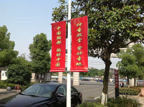 中國宜興陶瓷博物館廣場車道旁吊掛著紅旗:中國陶都•陶醉中國•神聖殿堂•紫砂聖地。