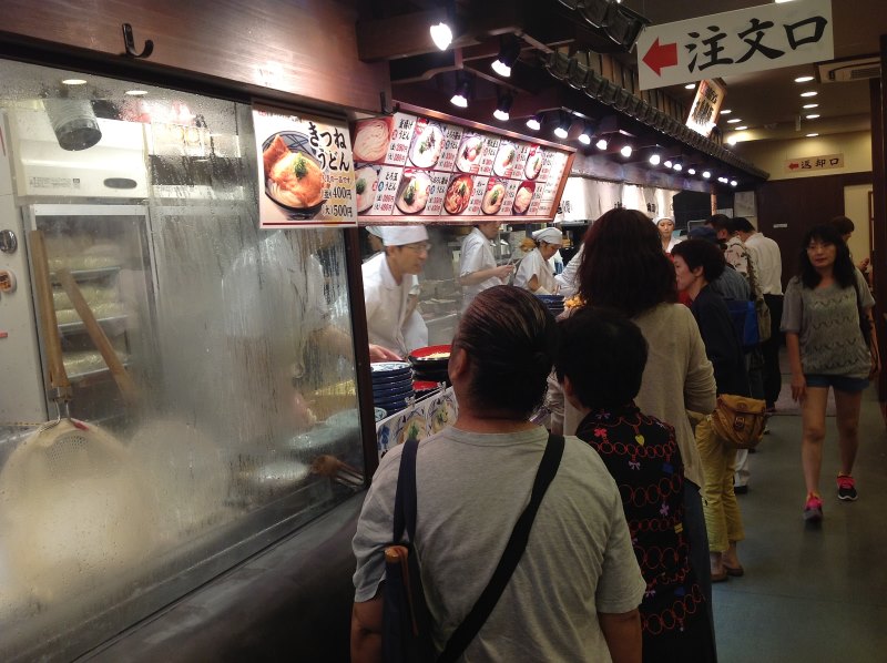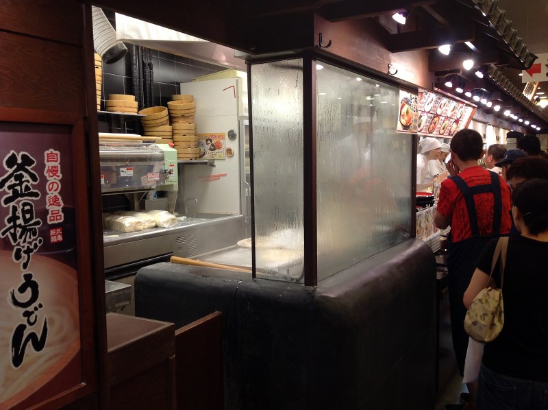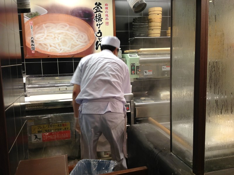 註:看見方鍋的旁邊躺平的大木棍沒?...這是用來攪動烏龍麵用的,師傅兩手緊握大木棍,很豪邁的攪開滾水中的麵條,一攪完立刻瀟灑的隨手一拋,真夠勁兒的!