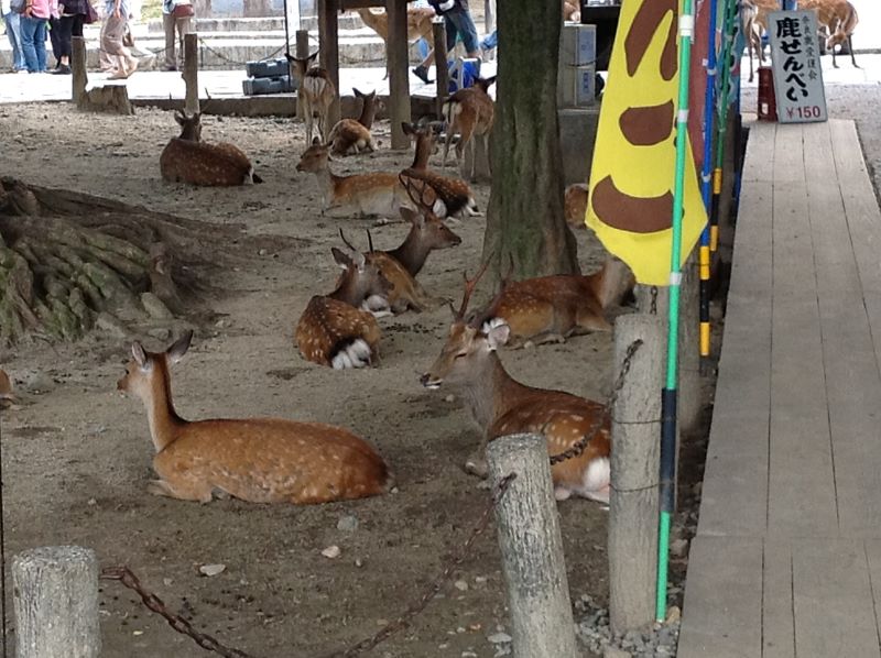 照片中看到的野鹿群,不是動物園,是在東大寺周圍的庭園裡,可自由來去,是千餘年繁殖不息的真正野鹿!