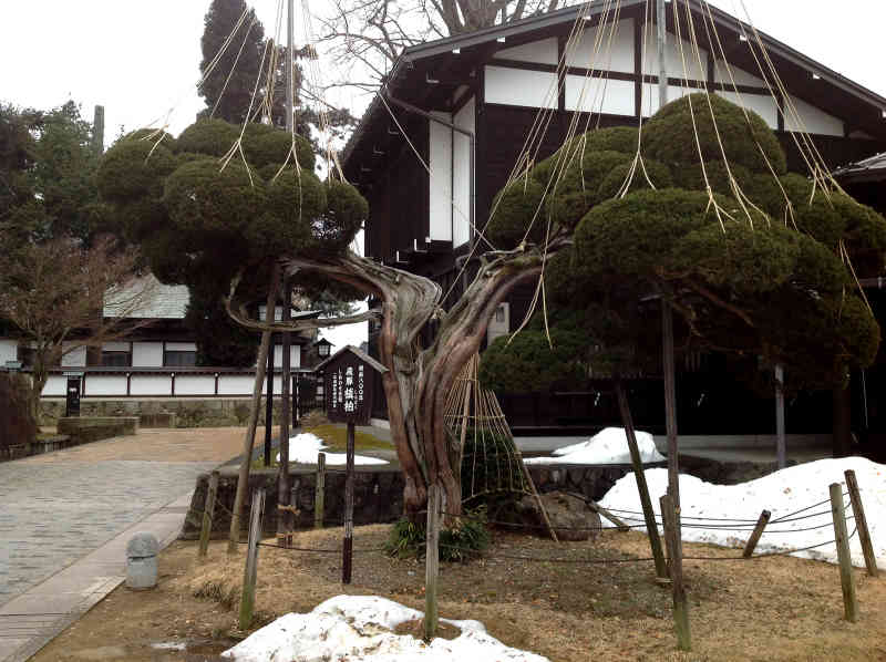 只可惜為了抵抗積雪的重量,所以不得已用繩子拉提、木棍支撐,以免壓垮百年名樹,惟...,卻破壞了自然的美景。