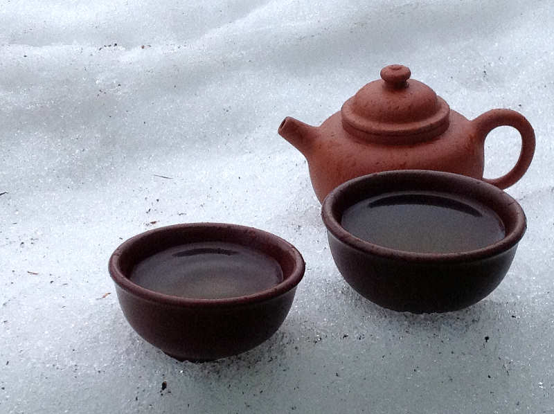 呵!呵!...起個大早,燒水溫壺,端坐雪旁,就這麼喝將起來...。