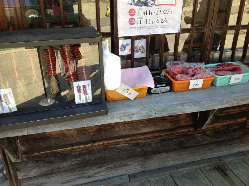 合掌村人用乾辣椒串綁成一串(應是吉祥物),製成手工藝品,就放在屋子外頭,要買自己投錢即可!