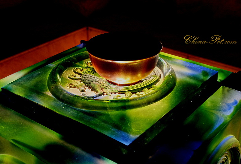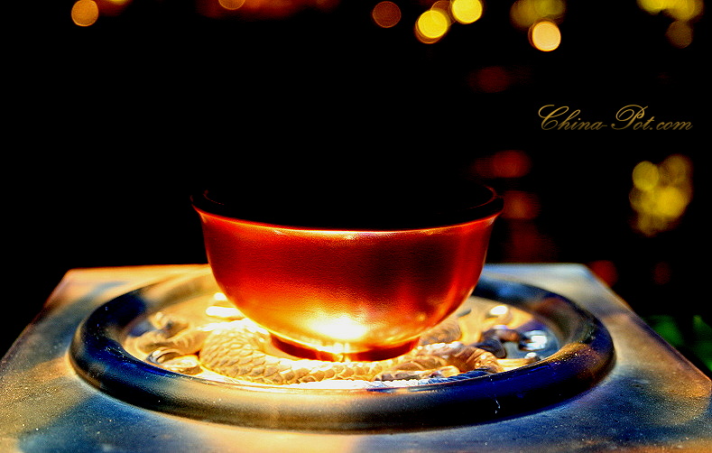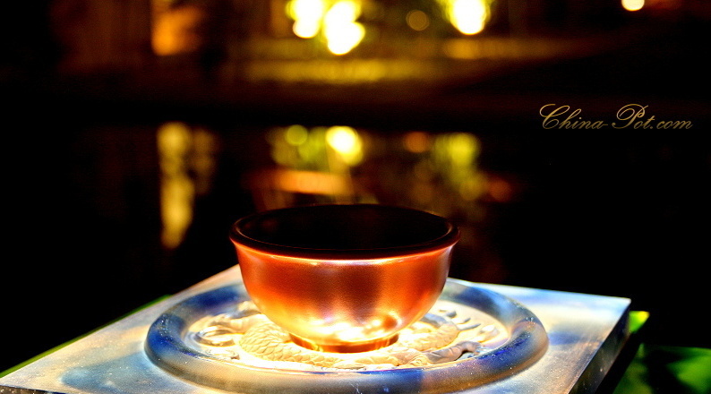 光從下方投射上,包漿後的蜜琉璃茶碗隨著光影流轉,還真成為晶瑩剔透、半透明狀的琉璃碗了!養成後擺設著鑑賞,就像似一件極美的藝術作品.....