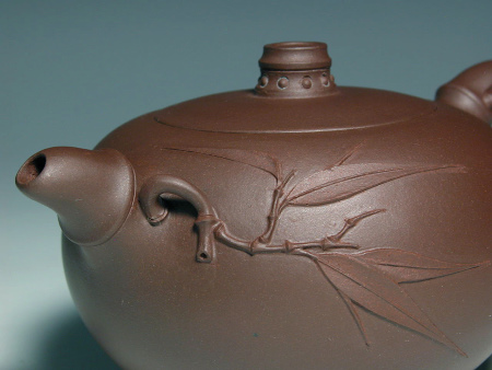 《圖為:鮑燕平手製•鮑志強(樂人)鐫刻裝飾:雙線德鐘壺j~拼紫泥》