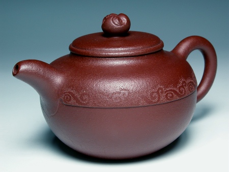失蹤多時,紫炻朱泥再現真壼,高老師手搏的「春色」,引來驚愕的秒奪,有幸得之,雀喜多日之情難以言表。輕撫壼身,觸手的冷豔,彷彿娓娓道來涵蘊其中的神秘。環身如雲似浪的浮雕,春息點飄浮盪而出,匯集如朶於壼鈕,上下繁簡相映成趣,啟人遐思,如天孕萬物於上,終歸圓潤安寂於地(下),流把前後相峙,過渡勻稱合度,精工球孔於內,出水順遂無阻,品賞之餘,拙筆如滯…。