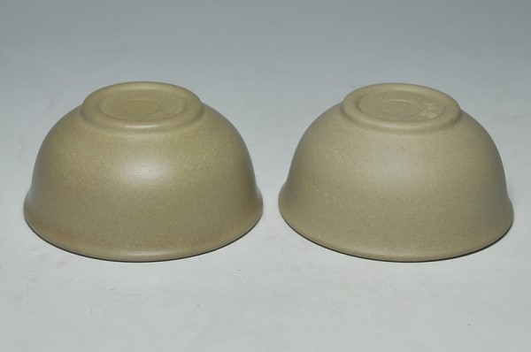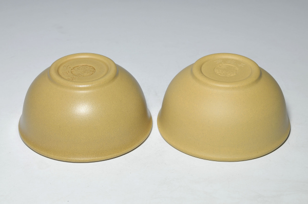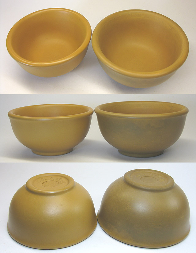 圖左的圓之月茶碗h~【黃袍子】為拿來品茗喝茶使用幾天後...;圖右則為未使用前,兩相對照之下,已可看出明顯的養成前後落差,使用過的茶碗,已顯更加清亮溫潤與色感豐富,茶湯更是再上一層樓,泥料特色盡現也!