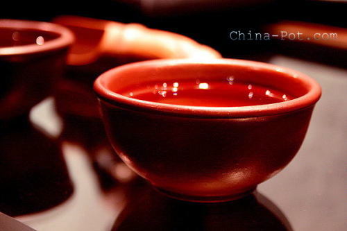 您可看到使用過的茶碗,已顯更加溫潤剔透,除了色感更加豐富之外(註:典型的純朱泥系泥料風格,愈泡愈顯紅潤),更使胎表的朱泥收縮皺紋益加明顯,茶湯之佳亦更加驚人...,可謂【灑金蜜瑰紅】特色之美盡現矣!