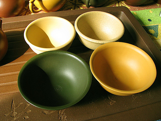 因為山莊裡的茶碗僅品飲高峰岩茶,因此養成的泥色普遍不至於太深,據有些喝普洱茶的朋友分享,窯白芝麻砂是可以變化成很美的深木質色的~