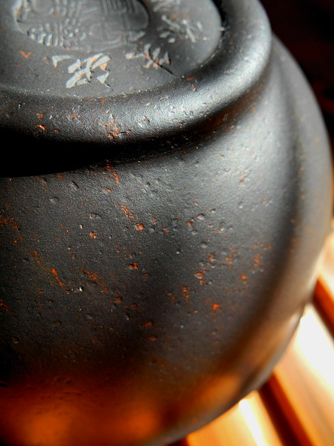 話說回來,這泥料真是絕妙,回練過的晚青蟻跡朱泥,像打過飛梭雷射(?)的毛孔,凹洞洞變小而綿密,但熱水沖淋後還是隱隱散發陣陣紅光,定睛一看,原來小小凹洞內的紅點點還是隱隱若現,養一陣子之後,整件作品沁出一種特殊的紅光芒,..漂亮啊!看來螞蟻品種是不太相同,但足跡還是美的各有千秋。哈哈。