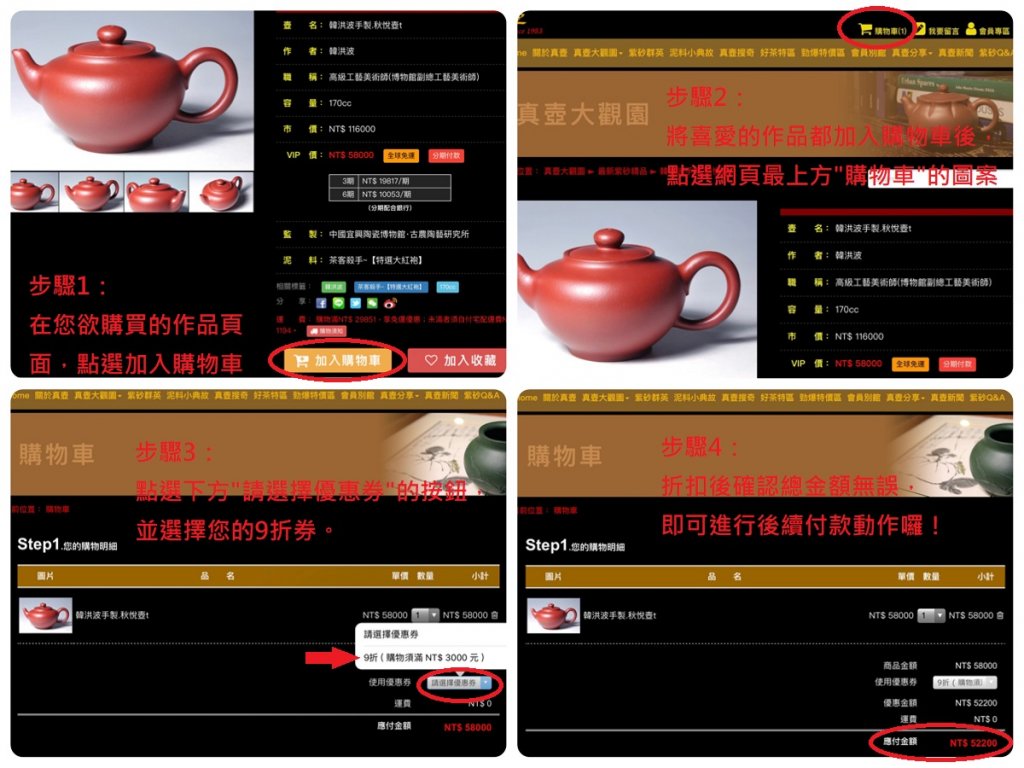 真壺已發送給每一位正式會員1張9折優惠券,您只要依照上圖步驟即可當場折扣總金額的九折!