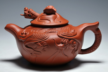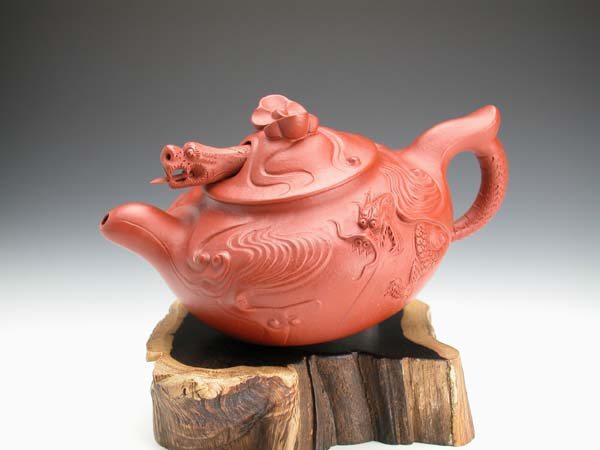 呵!呵!...樓上壺中歲月老弟所貼之“雲龍壺”,就是市面上最常見、千篇一律之“模式”,...也就是說,形式無力(壺嘴僵直,壺把臃腫無力)、神態單薄(擋模味充足,所有的凹與凸只現單薄之匠氣),畫面的繁複之處似乎也偷掉了不少...。(如壺肩中央的龍身、左方壺腹處的龍爪、及龍吐水的水等等...,都不知跑哪去了?)