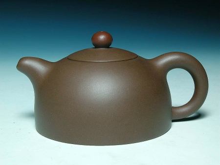 覆碗造型的壺身,歷來多有詮釋,但是這壺卻作的飽滿圓潤,壺嘴、壺把力量充盈,過渡協調完美一氣呵成,喜歡,真是把氣吞日月的好壺。好奇的是,這壺紐潤色是計劃之中或是即興之作………..