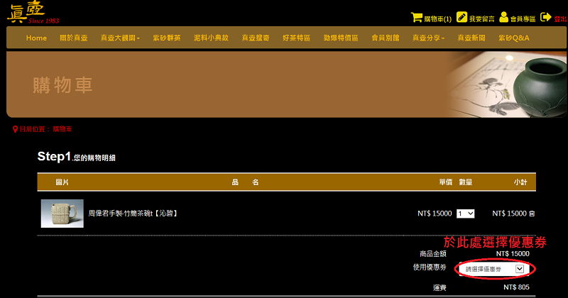 (3)優惠券使用是在進入購物車結帳時做選取(如圖所示),如需合併多張優惠券、或將優惠券拆開使用,請聯繫真壺,我們將盡速為您處理!(建議您多利用真壺LINE或微信,我們可以更快為您處理!加入方式請見"關於真壺")