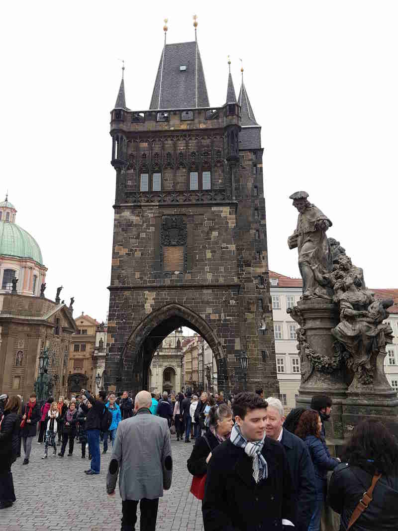 查理大橋近拍,鏡頭可見石欄杆上有宗教的聖像,高高的黑色建築就是火藥塔。