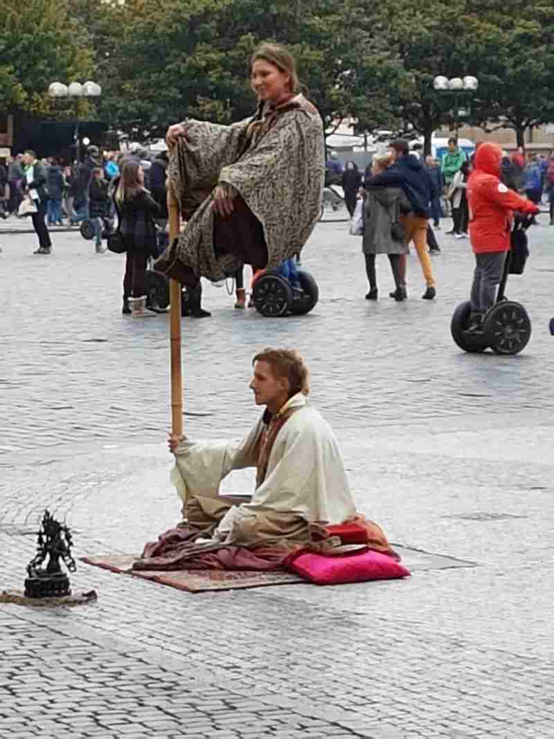 廣場上的街頭藝人...,聽說正面拍照或合影要給小費,老麻瓜一時找不到小鈔...,只好來個遠距免費側拍了!