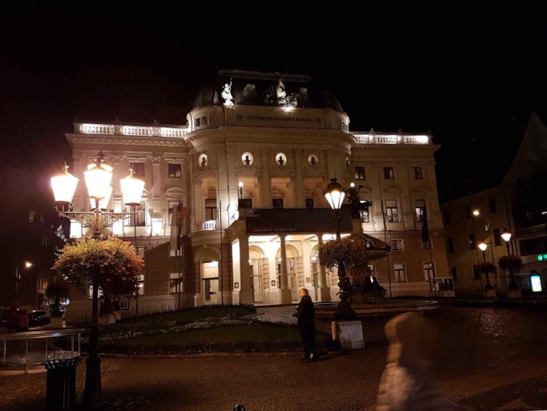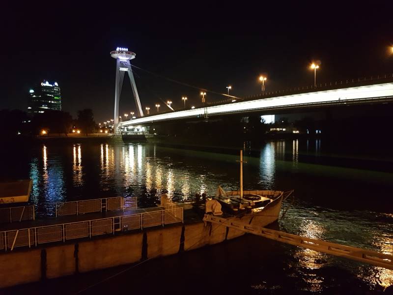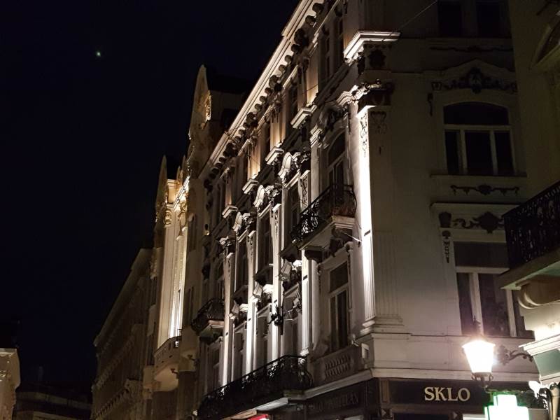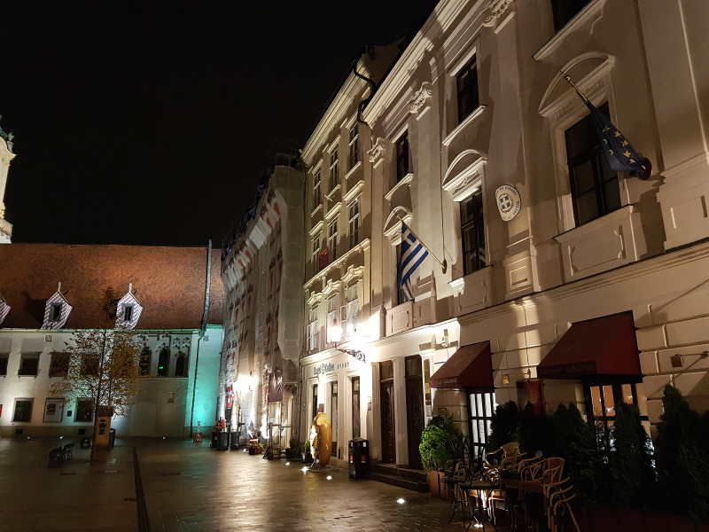 在“布拉第斯拉瓦市”鬧區,仍可見丘陵上的“布拉第斯拉瓦城堡”,倒立的桌子正綻放著耀眼的燈光。