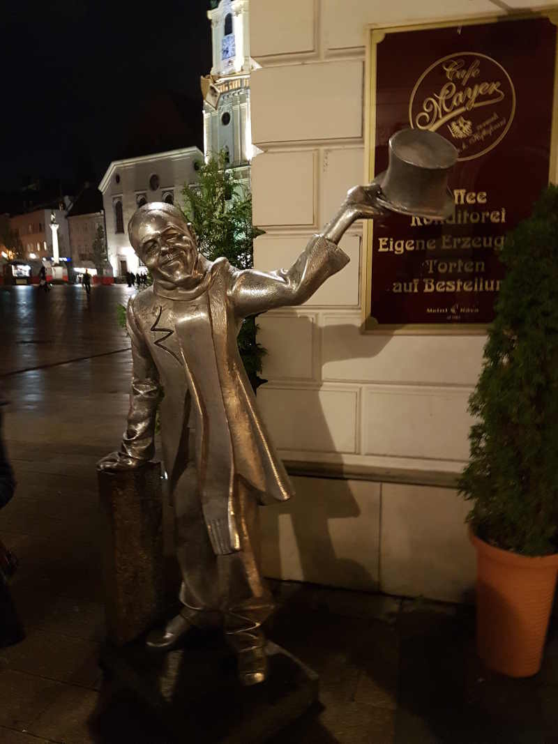 這件雕像名為Schoner Naci,他爺爺是著名的小丑,因受到啟發,而想要帶給人們歡樂,所以常常戴著高帽,向來往的婦女打招呼,說“讓我親吻妳的手”!