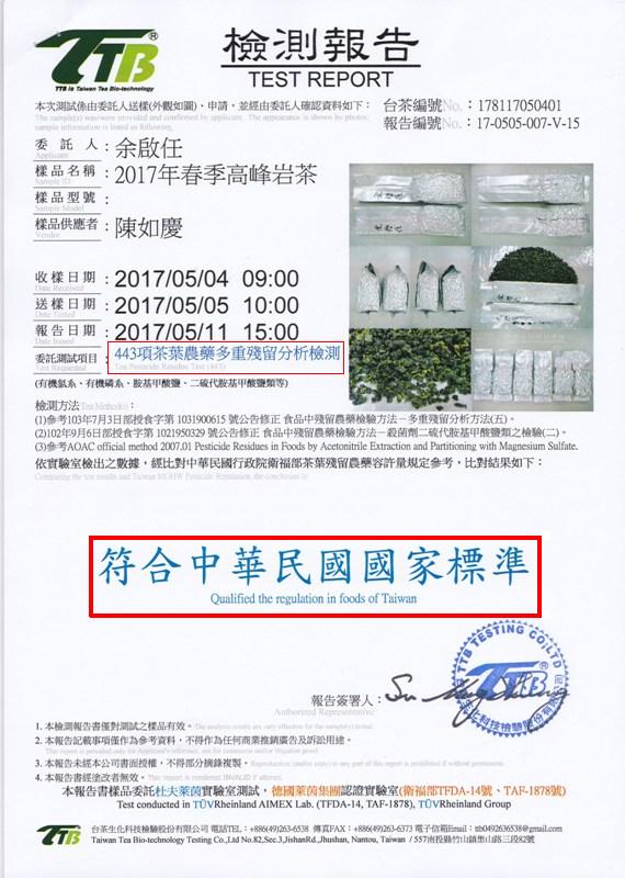 為了讓大伙們能絕對安心的闔家品茗好茶,確保真壺山莊自產的好茶100%安全無毒,所以今春以更嚴謹的態度,送檢443項,當然的,100%全數輕鬆過關!