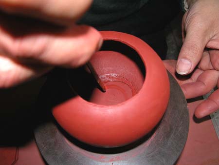 當由泥片銜接處溢出稀泥後,作家會以製壺工具~“竹插”修刮整飾溢出的稀泥,先如附圖般順著銜接底片的形狀刮平稀泥,待敲好底章後,再以“竹插”由壺內底的中心順著身筒內部由下往上刮一小平面(因竹插乃竹製工具,所以修刮後就會留下細紋狀竹子的纖維痕跡),直至刮好一周後,就是典型的宜興壺內部特有表情!(1209先生的壺內圖片,就是如假包換的宜興壺內部特徵之一)