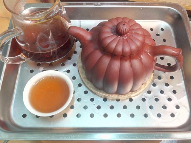 下午溫了壺(熱水一淋壺表...壺顏色變比較沈,真漂亮呢),抓了一點點大鴻運丟壺裡...浸了一段時間才倒出來喝,感覺嘟嘟好... 只要泡一次,慢慢喝,又不用喝太多茶,老讓自己的胃三不五時ㄉ抗議說.