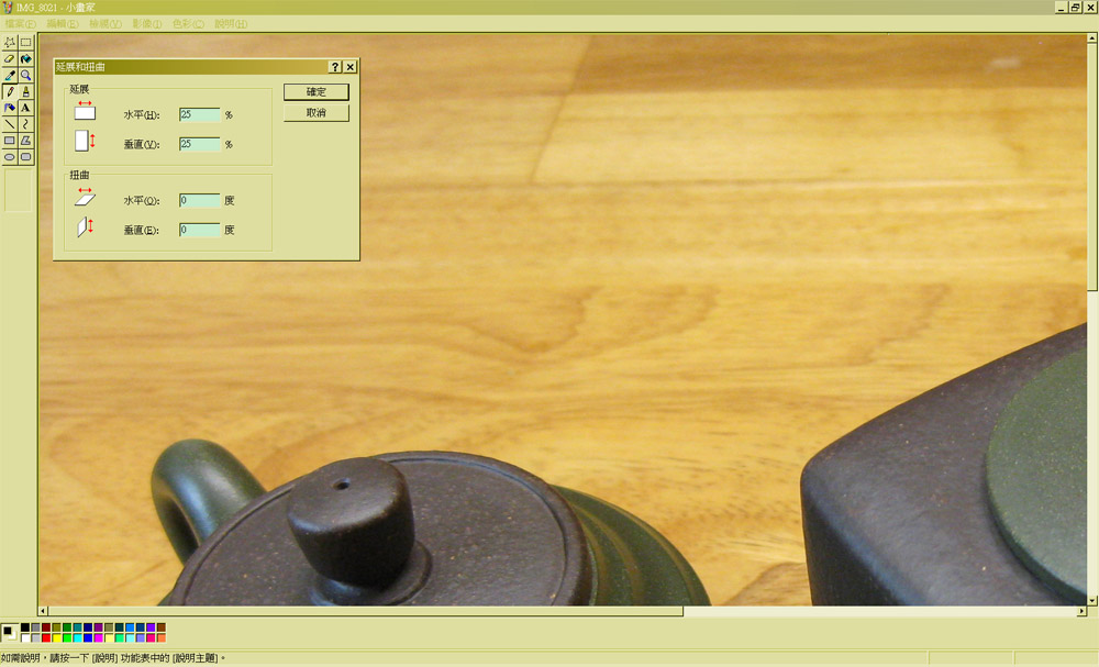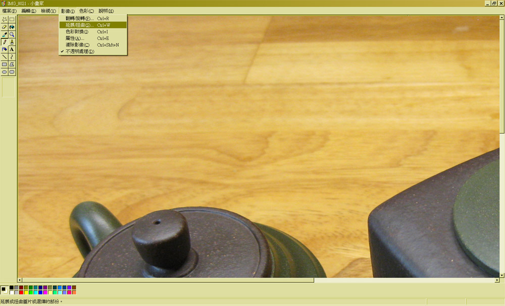 打開小畫家,檔案-->開啟舊檔-->影像-->延展/扭曲。這張原始維度是2592x1944,用小畫家打開已經超過整個螢幕的範圍