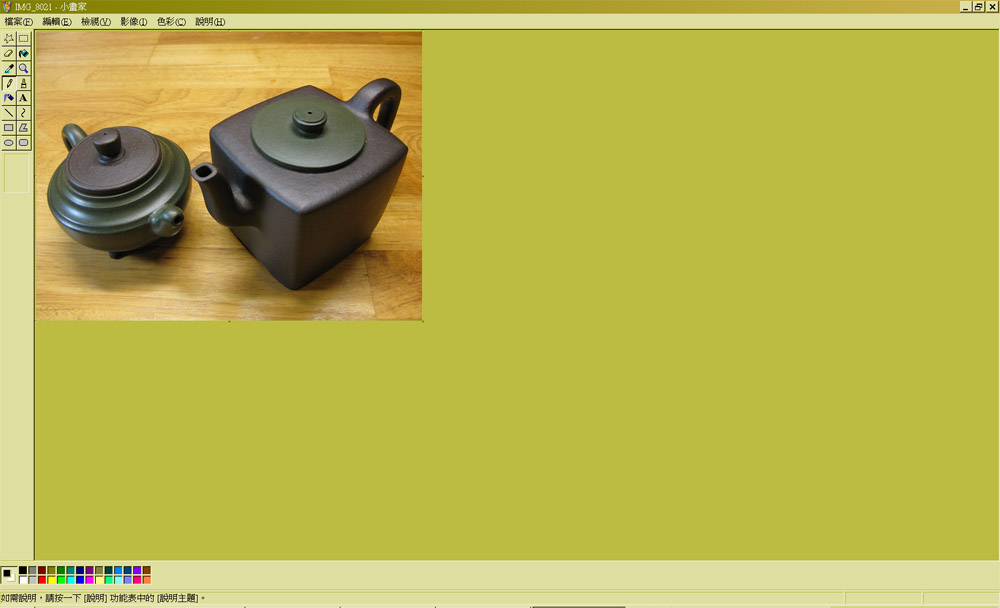 如果要把您美美的壺照貼在會員別館,但您的電腦沒有任何修圖軟體,建議可以用Windows檔案總管來看看它的維度,並且用小畫家就可以把圖縮小,建議在別館上照片的維度是 640X480 或 800x600。