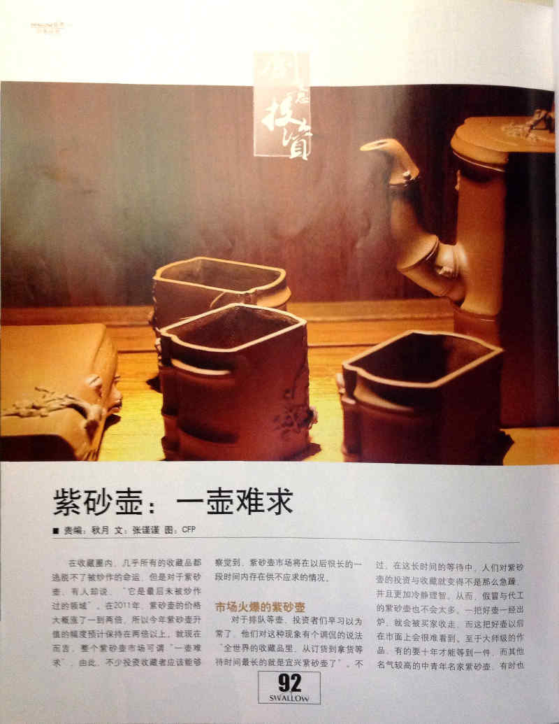 在收藏圈內,幾乎所有的收藏品都逃脫不了被炒作的命運,但是對於紫砂壺,有人卻說〝他是最後未被炒作過的領域〞,在2011年,紫砂壺的價格大概漲了一到兩倍,所以今年紫砂壺升值的幅度預計保持在兩倍以上,就現在而言,整個紫砂壺市場可謂〝一壺難求〞。由此,不少投資收藏者應該能夠察覺到,紫砂壺市場將在以後很長的一段時間內存在〝供不應求〞的情況。