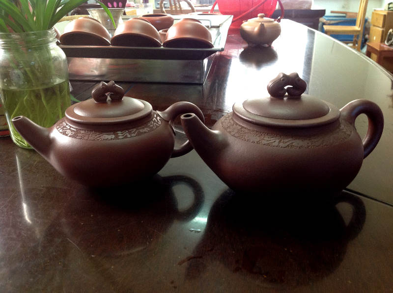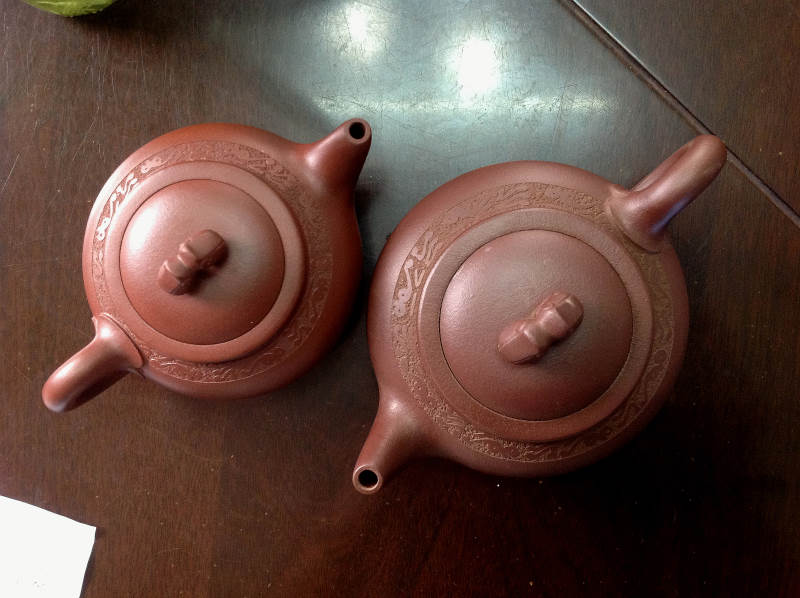 左為剛出窯超折騰人的“雁過紅”~紫碧壺,與右“飛來石”~紫碧壺。