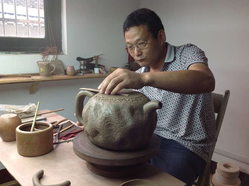 許仲老師爽快的答應並立時動手,大膽的切下壺嘴(老麻瓜註:嘿!嘿!一下午連切兩次壺嘴下來,直所謂一回生二回熟嘛!),再迅速的切一泥條,徒手捏成泥環,沾上稀泥就直接套在身筒網孔的外側圈子,再將切下的壺嘴沾上稀泥,再銜接上泥環之上,真是直率極了!