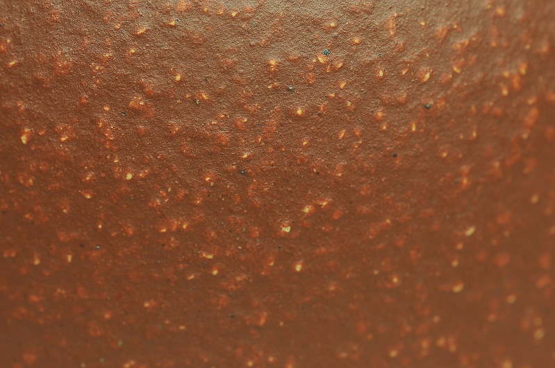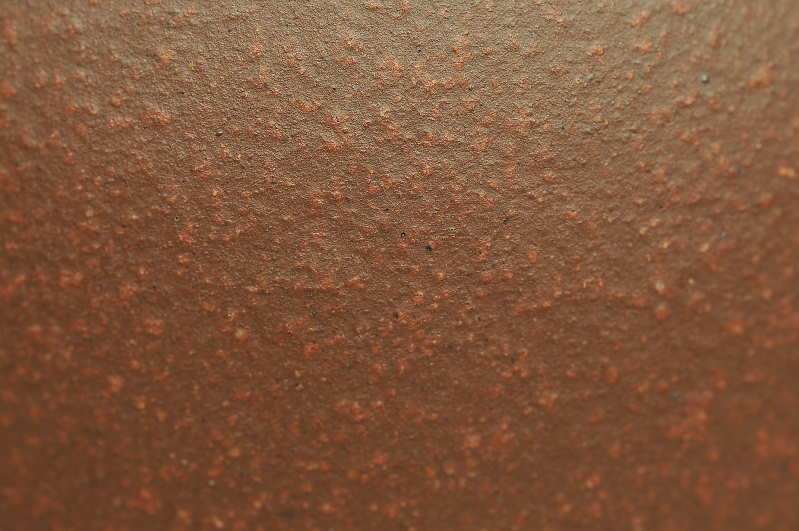 胎表特色:水色中等,擁有棕紅的美麗迷人胎色,一經泡養包漿甚速(因全漿及純朱泥本質所致),胎表視之粗礪中帶有十分迷人的特殊感受,用手撫之滑順而起伏,可謂“觸感之神奇”堪稱一流!